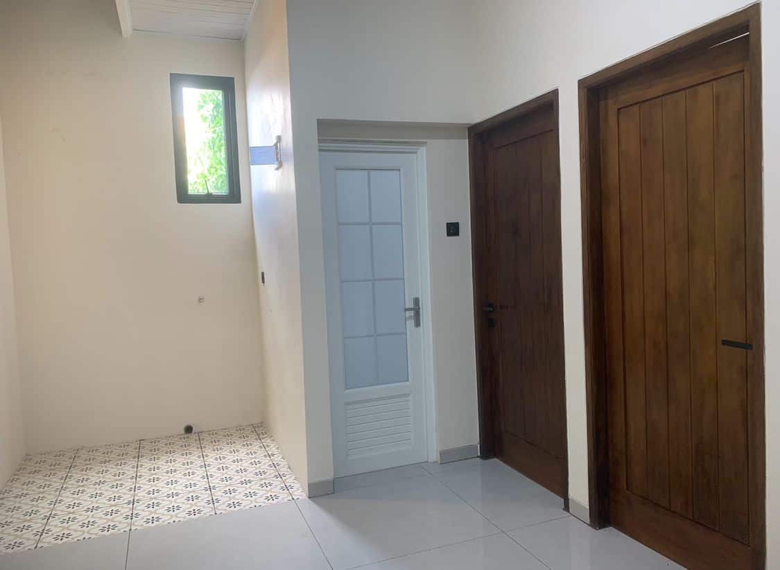 • Pintu dan kusen dari kayu Kamper Samarinda oven dengan finishing melamin, memberikan daya tahan tinggi dan tampilan elegan.